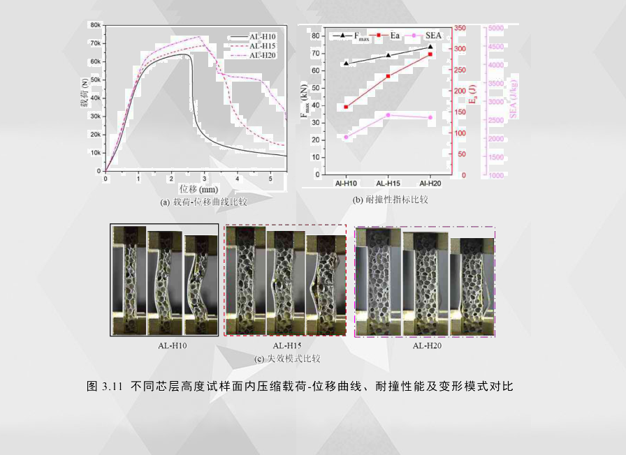 從其耐撞性指標(biāo)圖3.11(b)中可以看出,鋁合金夾層結(jié)構(gòu)的峰值載荷及總吸能隨芯層高度的增加而增加,而其比吸能的變化趨勢則不然。當(dāng)夾層結(jié)構(gòu)的芯層高度從10mm增加到15mm,試件在第三階段的主要失效模式由整體屈曲變?yōu)槊姘迩緦悠茐姆绞揭舶l(fā)生了變化,由于后者的失效模式吸收的能量比前者多很多,所以即使結(jié)構(gòu)的重量有所增加,但AL-H15的比吸能(SEA)仍比AL-H10高。而當(dāng)夾層結(jié)構(gòu)的芯層厚度從15mm增加到20mm時(shí),試件在第二、三階段的主要失效模式基本未發(fā)生變化,雖說后者在第三階段的吸能會更多一些,但畢竟總吸能提高的幅度有限,所以AL-H15比AL-H20的比吸能(SEA)更高。