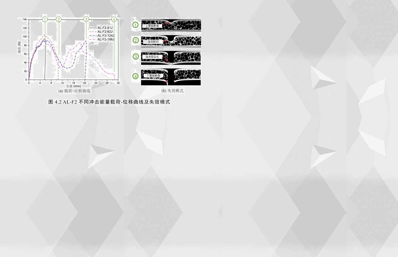 圖4.2為AL-F2在不同沖擊能量下的載荷-位移曲線及失效模式,AL-F2在166J沖擊能下試件完全穿透,其載荷-位移曲線有兩個峰值載荷,結(jié)合其在不同沖擊能量下最終損傷CT掃描圖,如圖4.2(b)所示,可以將結(jié)構(gòu)響應(yīng)分為三個階段,第一階段為沖頭接觸到上面板到抵達(dá)第一次峰值載荷,由于這個過程半球狀沖頭與面板的接觸面積不是線性增長且面板逐漸發(fā)生塑性變形,所以此階段的載荷呈非線性增長,當(dāng)上面板出現(xiàn)裂紋時,如圖4.2(b)中①,載荷到達(dá)第一個峰值載荷;第二階段為第一次峰值載荷到第二次峰值載荷,在此階段的前半階段載荷持續(xù)下降到波谷,主要的失效模式為上面板裂紋的出現(xiàn)以及擴(kuò)展,與此同時,泡沫芯層受到一定程度的壓潰,在第二階段的后半階段,由于泡沫鋁芯層被壓實(shí)至密實(shí)化,如圖4.2(b)中③所示,載荷再一次持續(xù)上升;第三階段即為第二次峰值載荷之后,開始于下面板出現(xiàn)裂紋到結(jié)構(gòu)完全失去承載能力。